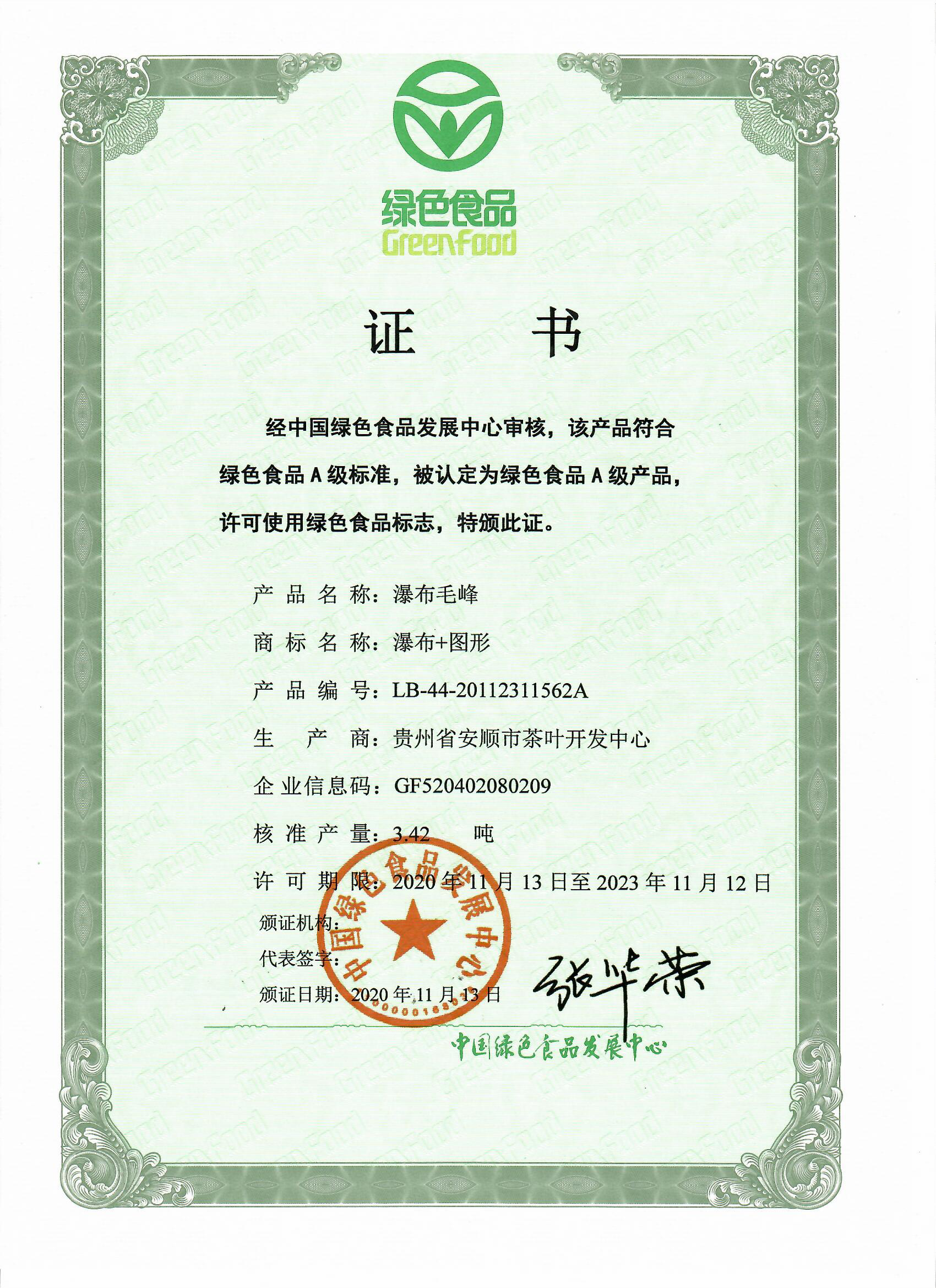 首頁 > 榮譽資質 > 綠色食品(瀑布毛峰)