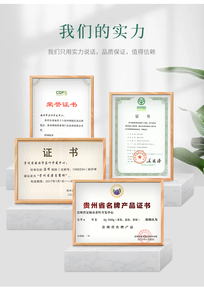 瀑布茶品牌是安順市人民政府主打茶葉品牌,省級重點打造區域公共品牌,屬貴州五大名茶,先后獲得獲“中國農產品區域公用品牌”、“貴州省著名商標”“貴州省名牌產品”等榮譽稱號近年來,在各級部門大力推動下,瀑布茶品牌不斷發展壯大。截止目前,現有瀑布茶品牌加盟企業23家,輻射茶園面積200000余畝其中綠色食品認證茶園基地面積7000余畝,有機食品認證基地面積2500畝擁有“瀑布毛峰”、“瀑布翠芽”“瀑布紅茶”、“瀑布翠龍”等產品,多次獲得“中綠杯”、“中茶杯”、“華茗杯”大獎;分別榮獲14屆中國國際農產品交易會金獎18屆中國綠色食品博覽會金獎“黃山杯”首屆全國傳統名茶產品質量特別金獎、安順十大旅游商品等殊榮及稱號。