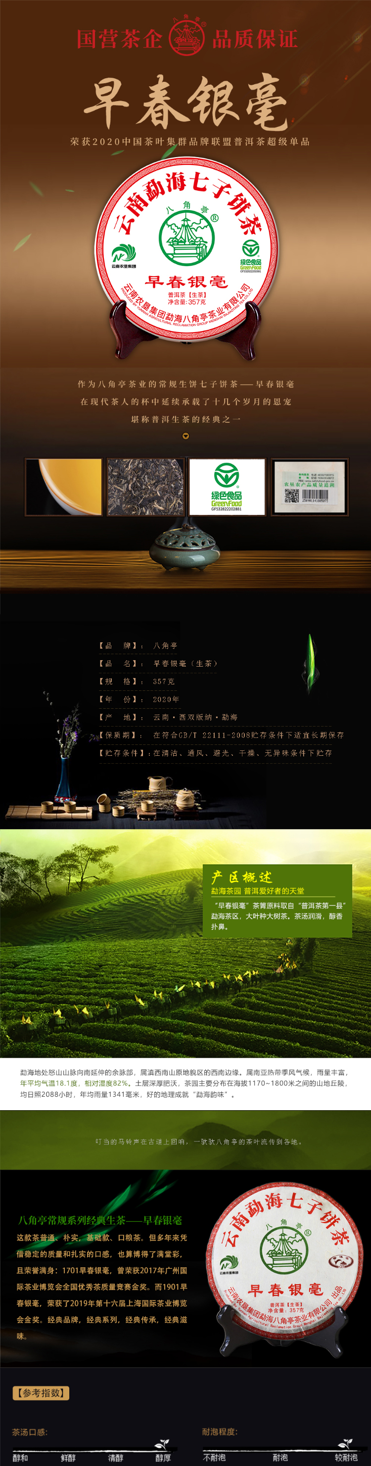 云墾茶業(yè)集團(tuán)下屬茶葉生產(chǎn)企業(yè)——云南農(nóng)墾集團(tuán)勐海八角亭茶業(yè)有限公司原名黎明茶廠,是我國(guó)歷史最為悠久的茶企之一,曾位列“中國(guó)普洱茶十大知名品牌”“十大最受歡迎茶葉品牌”、“中國(guó)普洱茶十大暢銷品牌”中,成為今天市場(chǎng)上最有影響力的品牌之一。公司產(chǎn)品獲得“綠色食品”、ISO9001、 HACCP和云茶品牌(YC)4項(xiàng)認(rèn)證,連續(xù)獲得“云南名牌農(nóng)產(chǎn)品”“云南名牌產(chǎn)品”“云南省著名商標(biāo)”等品牌榮譽(yù),公司生產(chǎn)的多款普洱茶在歷次專業(yè)評(píng)比中多次獲得特等金獎(jiǎng)和金獎(jiǎng)。在2018第五屆中國(guó)企業(yè)五星品牌論壇上,云南農(nóng)墾集團(tuán)勐海八角亭茶業(yè)有限公司上榜中國(guó)普洱茶行業(yè)影響力品牌——“金芽獎(jiǎng)”,公司負(fù)責(zé)人陳勝軍先生獲“陸羽獎(jiǎng)”,被授予2017“國(guó)際十大杰出茶人”榮譽(yù)稱號(hào)。