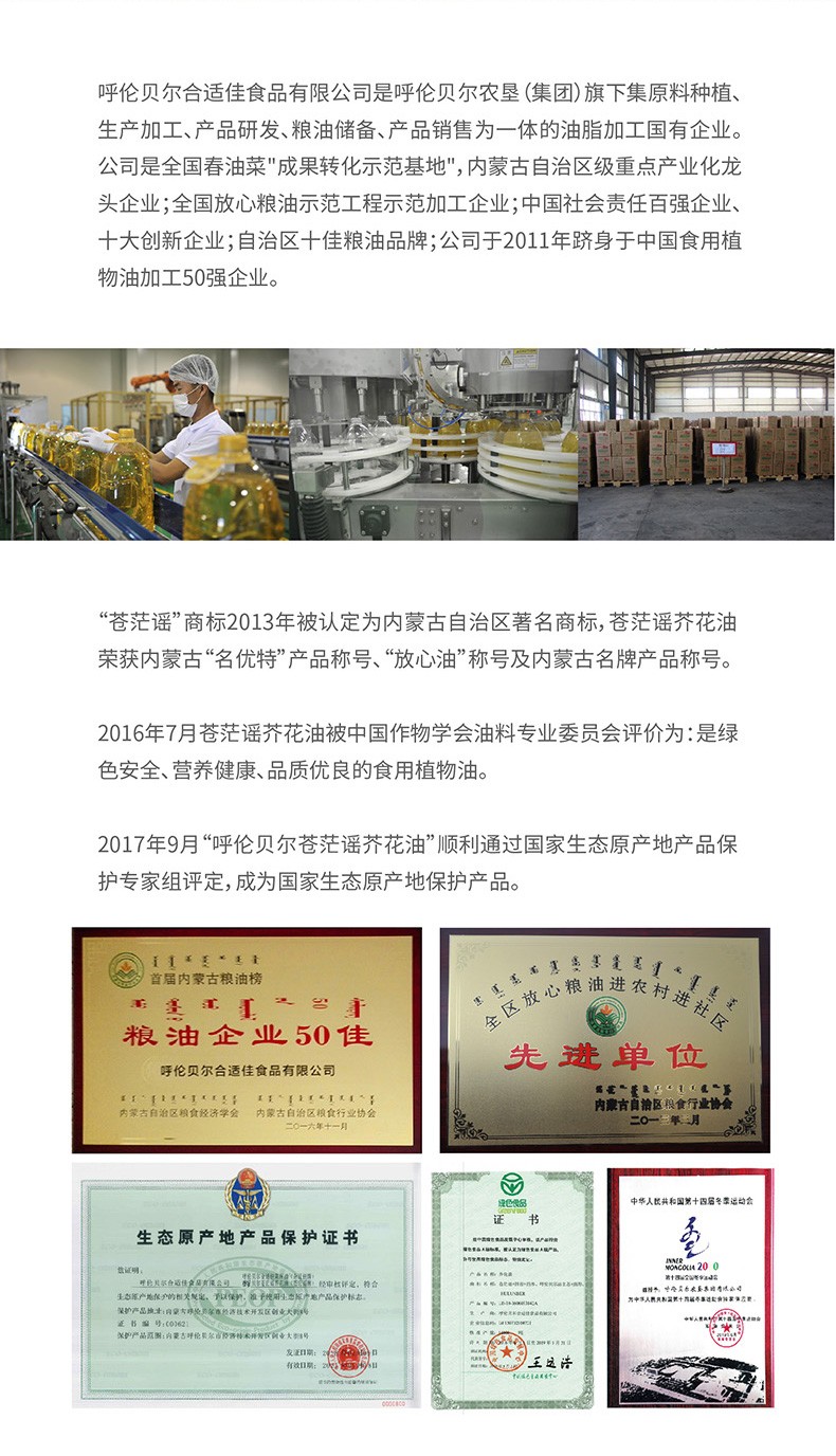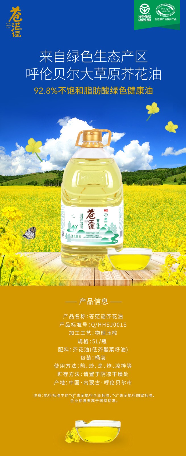呼倫貝爾農墾出品蒼茫謠芥花油非轉基因純正食用油5L大桶低油煙