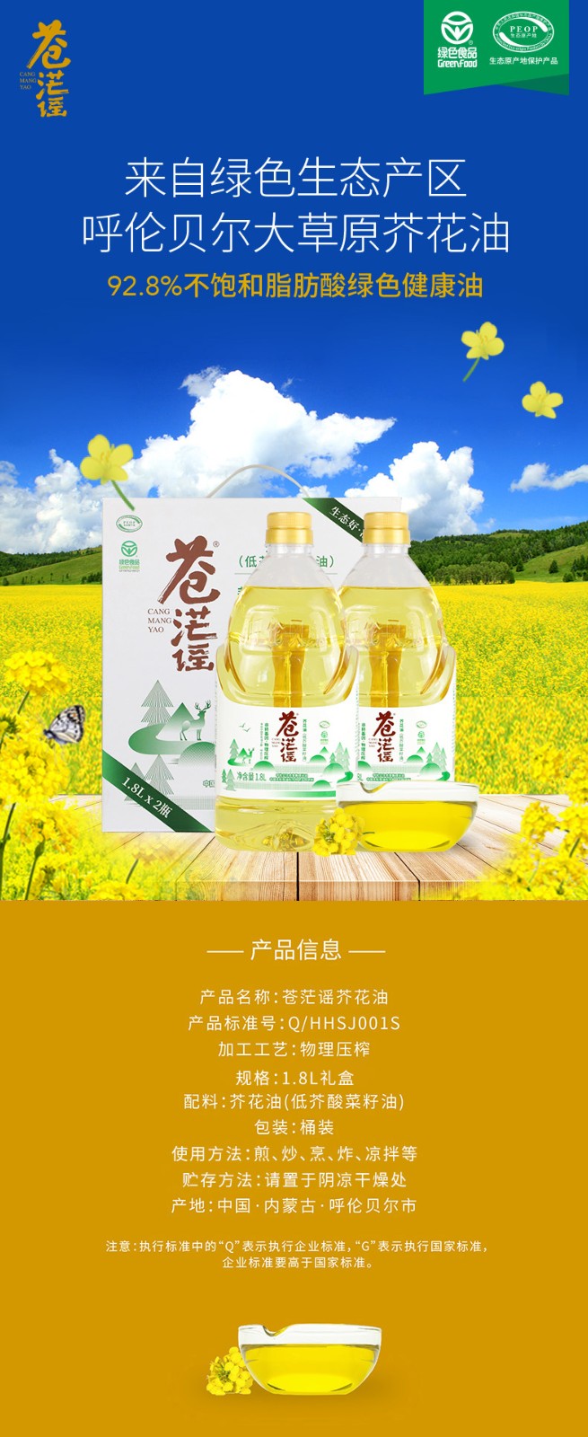 呼倫貝爾農(nóng)墾出品蒼茫謠芥花油非轉(zhuǎn)基因菜籽油1.8L*2禮盒